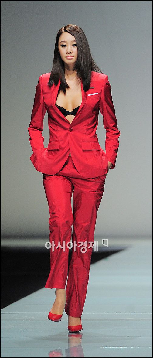 가슴라인이 훤히 드러난 란제리 위에 정열적인 붉은색 수트를 걸친 최여진은 근육질 남성 모델들과 어울려 남성복을 멋지게 소화했다.