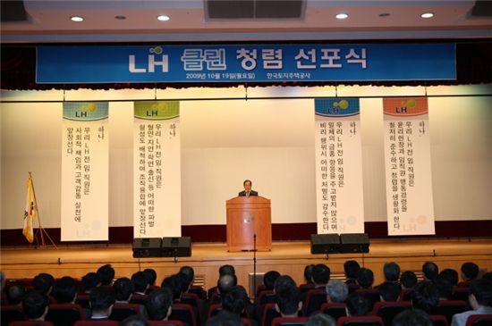 LH는 19일 오전9시 분당 정자사옥에서 'LH 클린 청렴선포식 행사'를 갖고 통합공사 출범과 함께 청렴이라는 새로운 무기를 장착, 서민 주거복지와 녹색성장의 공적미션을 수행하는 청렴공기업으로 탄생하겠다는 의지를 대내외에 공표했다.