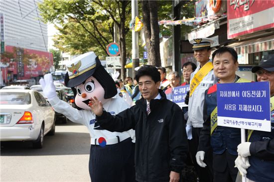 이날 지부 회원 80여 명은 거리를 지나는 시민들에게 6대 기초질서지키기와 승요차요일제 참여를 안내하는 전단 1000매를 배포했다.