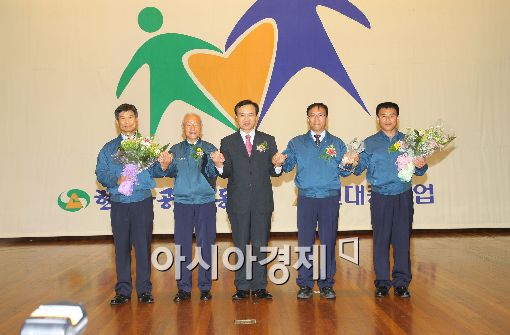 [아시아경제 김현정 기자]현대중공업이 19일 울산 현대중공업 체육관에서 열린 2009년 노사문화대상 시상식에서 임태희 노동부 장관으로부터 대통령상을 수상했다. 최길선 현대중공업 사장은 이날 "현대중공업의 노사관계는 이제 기업 단위 범주에서 머무르는 것이 아니라 국민들에게 희망을 줄 수 있는 국민형 조합주의를 실천할 것"이라며 '국민형 조합주의'를 천명했다. 사진은 (왼쪽부터) 최길선 현대중공업 사장, 민계식 부회장, 임태희 노동부 장관, 오종쇄 노조위원장, 김도현 노조수석부위원장.