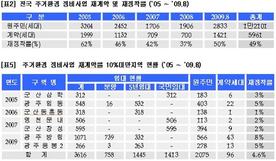 또 주거환경정비사업의 원주민 평균 정착률은 49%대로 10명중 5명은 정착하지 못하는 것으로 나타났다.