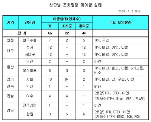 정부의 정화조치 명령을 이행하지 않고 있는 업체의 산단별로 보면 ▲인천 한국수출산단 7개 ▲대구 성서산단 12개 ▲서대구산단 12개 ▲울산 온산산단 2개 ▲울산 미포산단 6개 ▲경기 시화산단 10개 ▲전북 익산산단 1개 ▲전남 여수산단 4개 ▲경남 진주상평산단 1개 ▲경남 창원산단 11개 등이다.