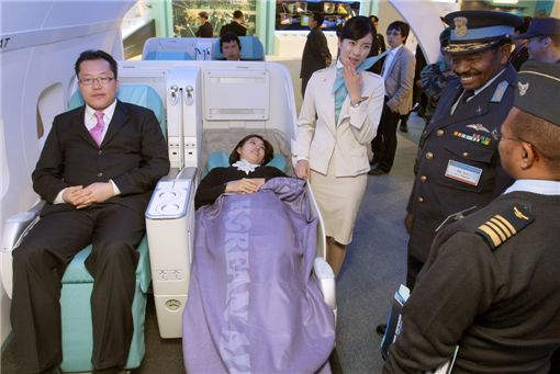 [아시아경제 김혜원 기자] 대한항공이 여객기 A380에 창착할 예정인 차세대 명품 일등석 '코스모스스위트'와 프레스티지석 '프레스티지 슬리퍼'가 2009 서울 에어쇼 현장에서 일반인에게 처음으로 공개된 가운데 관람객이 프레스티지석 '프레스티지 슬리퍼' 좌석을 체험하고 있다.