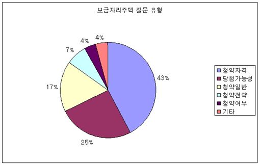기타 질문으로는 보금자리주택 투자성 문의 8개, 보금자리주택 대출문의 5개, 보금자리주택 공급계획에 대한 문의가 3개 등이었다.