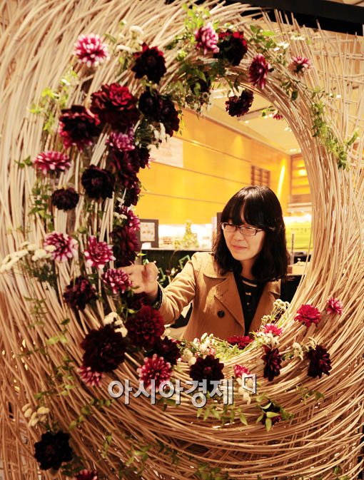 전시회를 찾은 한 여성 관람객이 청강문화산업대학 플라워 학과에서 만든 실내인테리어 장식품을 둘려보고 있다.