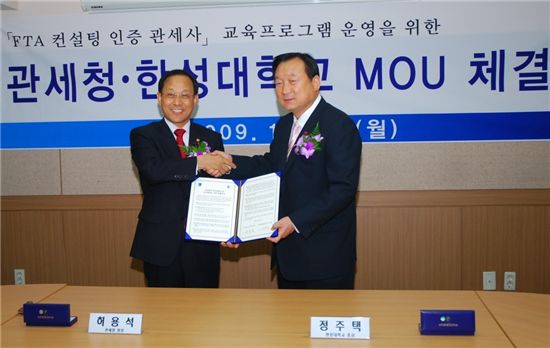 [아시아경제 왕성상 기자] 관세청은 26일 한성대학교와 수출?입회사의 FTA(자유무역협정) 활용컨설팅을 해줄 ‘FTA 전문관세사’ 양성교육프로그램 양해각서(MOU)를 주고받았다.