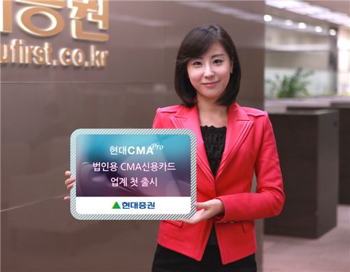 [아시아경제 이솔 기자]현대증권(대표이사 최경수)이 26일 현대카드와 제휴하여 업계 최초로 법인용 CMA신용카드 상품인'현대CMApro 법인신용카드'를 출시했다고 밝혔다.