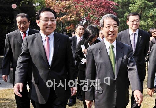 [아시아경제 윤동주 기자] 26일 서울 삼청동 총리공관에서 열린 중소기업 회장단 오찬 간담회에 참석한 정운찬(가운데) 국무총리와 김기문(왼쪽) 중소기업중앙회 회장이 의견을 나누고 있다.