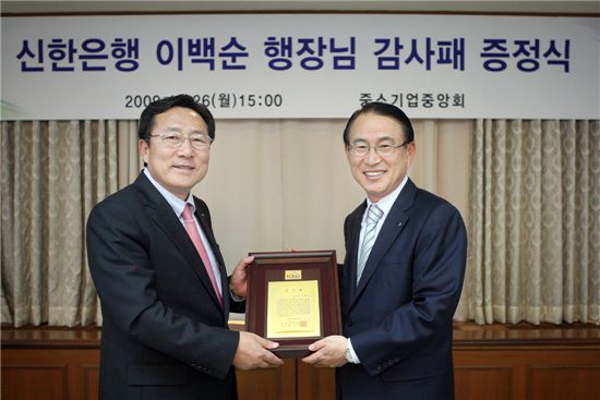 [아시아경제 김대섭 기자] 중소기업중앙회(회장 김기문)는 26일 오후 3시 여의도 중앙회에서 중소기업의 일자리 창출에 기여한 공로로 이백순 신한은행장에게 감사패를 증정했다.