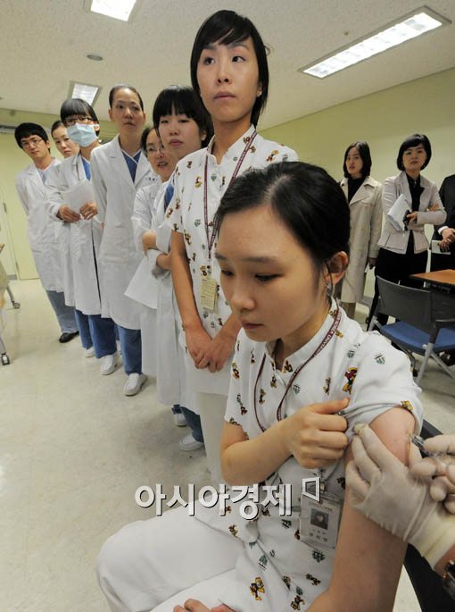 [아시아경제 윤동주 기자] 신종플루 예방백신 접종이 치료거점병원 등 의료기관 종사자들을 대상으로 시작된 27일 오전 서울 구로구 구로고대병원 의료 종사자들이 예방접종을 받고 있다.