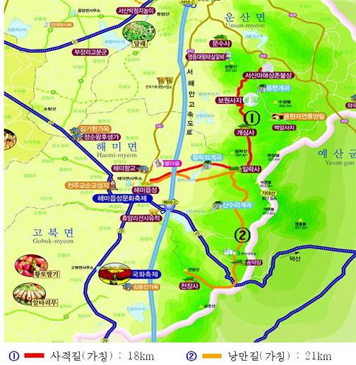 먼저 내년 상반기까지 6억원을 들여 ‘사적길’(마애삼존불-보원사지-전망대-개심사-일락사-해미읍성) 18km와 ‘낭만길’(해미읍성-황락저수지-일락사-산수계곡-한티고개-천장사) 21km 등 2개 코스를 뚫는다.