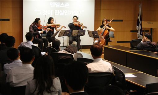 이날 클래식 음악교실은 현악4중주 콰르텟엑스가 연주하는 하이든, 비발디, 생상스 등 난해한 클래식 음악을 바이올리스트 조윤범이 음악에 얽힌 재미있는 히스토리를 설명하는 형식으로 진행됐다.