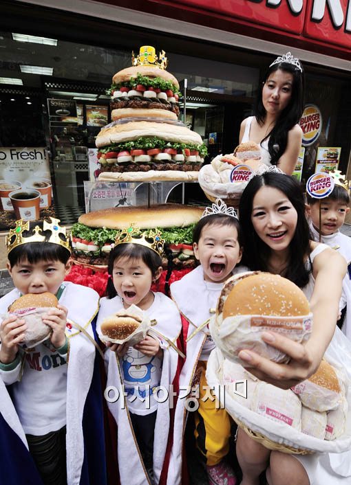 [아시아경제 윤동주 기자] 버거킹은 국내 주요 3대 협회(한국생산성본부, 능률협회, 표준협회)에서 선정한 패스트 부문 고객만족도 1위 선정을 기념해 27일 서울 중구 버거킹 명동점에서 '대형 3단 버거 케익'앞에서 왕관을 쓴 아이들이 고객 감사 이벤트를 진행하고 있다.