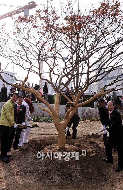 오세훈 서울시장, 앙드레김, 하일성 야구 해설위원등 주요인사들이 기념식수를 하고 있다.