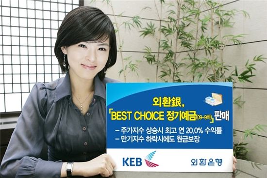 [아시아경제 박성호 기자]외환은행은 만기 해지시 주가지수 변동률 조건에 따라 각각 최고 연 7.5% 와 20.0%의 시장금리 이상의 수익 달성이 가능한 베스트초이스 정기예금(09-9차)을 29일부터 판매한다고 밝혔다.