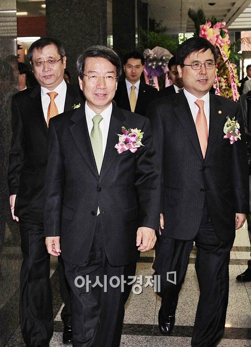 진동수(오른쪽부터) 금융위원장, 정운찬 국무총리, 유재한 정책금융공사 사장이 행사장으로 들어서고 있다.