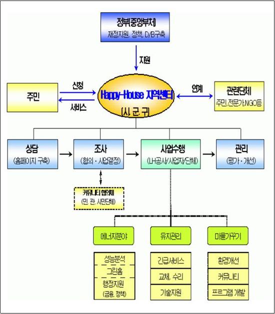 해피하우스 사업은 대통령 직속 국가건축정책위 주관으로 추진중인 뉴하우징 운동(지속가능한 신주거문화 운동)의 핵심사업의 하나로, 단독과 다세대 등 기존 주택에 대한 주거서비스를 개선하기 위한 지역밀착형 주거서비스 지원사업이다.