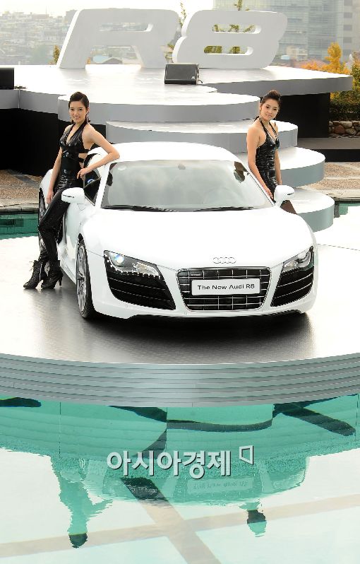 [아시아경제 이재문 기자] 아우디 코리아가 29일 오전 서울 남산 그랜드 하얏트 호텔 풀사이드에서 더욱 다이내믹해진 디자인과 보다 강력한 성능을 발휘하는 엔진으로 업그레이드 된 하이 퍼포먼스 스포츠카 '뉴 아우디 R8'을 선보이고 있다.