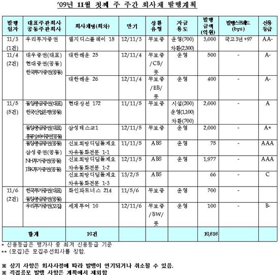 금융투자협회가 30일 발표한 ‘2009년 11월 첫째주(11월2일~6일) 회사채 발행계획 집계’에 따르면 우리투자증권이 주관하는 LG디스플레이 18회차 3000억원을 비롯해 총 10건 1조818억원의 회사채가 발행된다. 이는 이번주(10월26일~30일) 발행계획인 13건 9000억원에 비해, 발행건수는 3건이 감소한 반면 발행금액은 1818억원이 증가한 것이다.