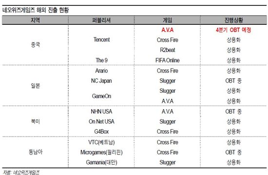 이창영 애널리스트는 "네오위즈게임즈의 장기 성장성 및 수익 안정성 전망이 긍정적인 이유는 향후 3년간 연평균 30%의 성장을 할 것으로 전망되는 중국 시장에서 FPS 게임 '크로스파이어'가 동시접속자수 150만 명으로 중국 내 PC 방 게임순위 2위를 장기간 기록하고 있기 때문"이라고 밝혔다. 그는 이어 "이밖에 A.V.A(4분기 공개테스트 예정) 및 EA 와의 공동 개발 게임(미정)을 추가적으로 중국 및 해외로 출시할 예정이어서 장기적으로 해외매출 비중 확대를 통한 성장성 및 수익의 안정성이 지속적으로 개선될 수 있을 것으로 판단된다"고 덧붙였다.