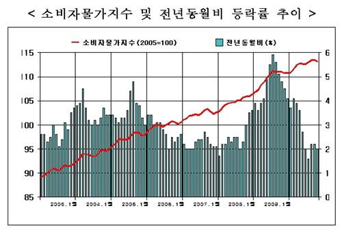 전년 동월대비 소비자물가 상승률은 지난 해 7월 5.9%로 정점을 찍은 뒤, 8월 5.6%, 9월 5.1%, 10월 4.8%, 11월 4.5%, 12월 4.1%, 올 1월 3.7%로 계속 하락하다 2월 4.1%로 소폭 상승했으며, 3월 3.9%, 4월 3.6%, 5월 2.7%, 6월 2.0%, 7월 1.6%, 8월 2.2%, 9월 2.2% 등을 기록했다.