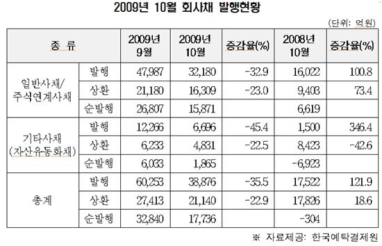 2008년 11월 이후 12개월 연속 순발행도 이어갔다. 월간 회사채 총발행액과 총상환액 집계한 결과 9월 3조2840억원 순발행에 이어 10월에도 1조7736억원의 순발행을 기록했다. 일반사채(주식연계사채 포함)의 경우도 9월 2조 6807억원의 순발행에 이어 10월 1조5871억원 순발행됐다.