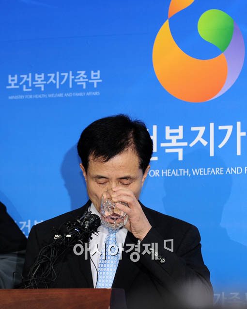 [아시아경제 윤동주 기자] 신종플루에 대한 국가전염병 재난단계가 최고 수준인 '심각(RED)' 단계로 높아진 가운데 3일 서울 종로구 가회동 보건복지가족부에서 박하정 보건의료정책실장이 신종플루 관련 대책을 발표하기 전 목이 타는듯 물을 마시고 있다.