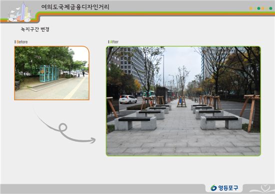 김형수 영등포구청장은 “디자인 거리 조성으로 여의도가 국제금융 중심지로서 인지도를 한단계 발전시키고 지역주민과 직장인들에게 바쁜일상에서 벗어나 휴식을 취할 수 있는 문화공간으로 재탄생 했다”고 밝혔다.