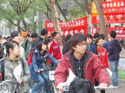 그래서 북경대 학생들은 놀거리를 동아리 활동에서 보충한다. 매년 붐비는 '싼쟈오띠'는 북경대 모든 동아리들의 홍보 장소다. 학기 초에 북적거리는 것도 이 때문이다. 100평 남짓 한 공간의 '싼짜오띠'에는 동아리당 2~3평 정도씩 빼곡히 들어서서 각자 동아리를 홍보한다.