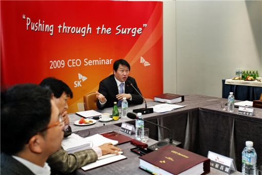 [아시아경제 김혜원 기자] 최태원 SK그룹 회장이 지난 2일부터 4일까지 중국 베이징의 ‘베이징 SK 타워’에서 열린 ‘SK CEO 전략 세미나’에서 신성장 동력 및 글로벌 사업 전략 등을 주제로 연설하고 있다.
