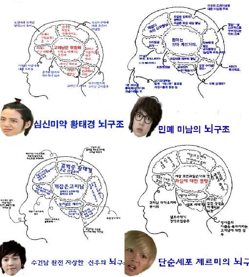 우선 극중 인기절정의 아이돌그룹 ‘A.N.JELL’의 리더 장근석이 맡은 ‘심신미약’ 태경의 뇌구조 중앙은 ‘고미남은 위험해’와 ‘고미남 거슬리는데 자꾸 엮여’가 가장 크게 자리잡고 있고, 앞머리에 있는 ‘유헤이 국민요정?’도 눈에 띈다.