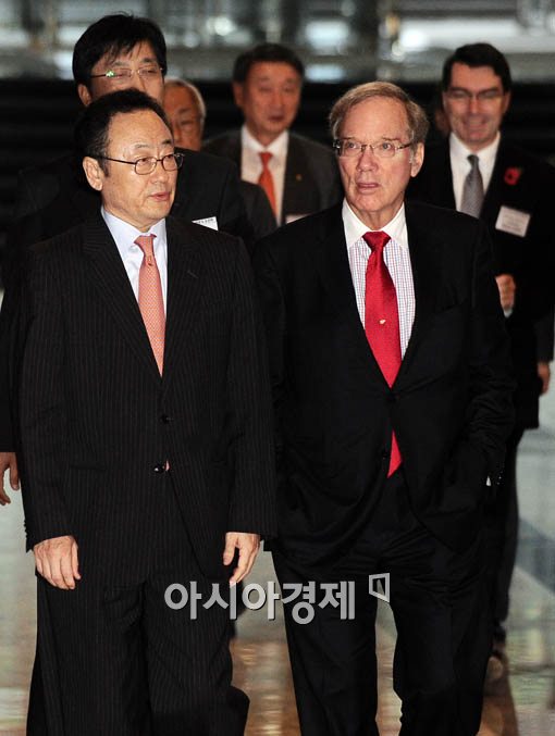 이날 '미국 무역 정책'에 대한 주제로 강연을 할 피터슨(오른쪽) 미 국제경제연구소장과 사공일 무역협회장이 환담을 나누며 들어서고 있다.