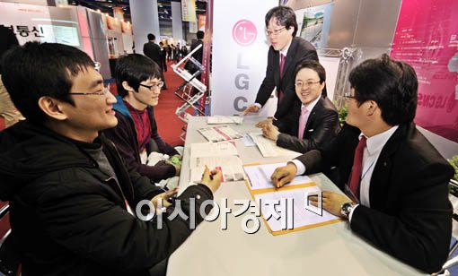 [아시아경제 윤동주 기자] 5일 서울 삼성동 코엑스에서 열린 '2009 한이음 일자리 엑스포'를 찾은 취업준비생들이 LG CNS 부스에서 현장 면접을 보고 있다.