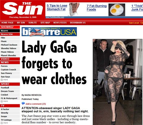 [아시아경제 이진수 기자] 5일(현지시간) 영국 타블로이드 신문 더 선에 따르면 엽기적인 패션으로 많은 화제를 몰고 다니는 팝스타 레이디 가가(23)가 전날 또 팬들을 놀라게 만들었다고.