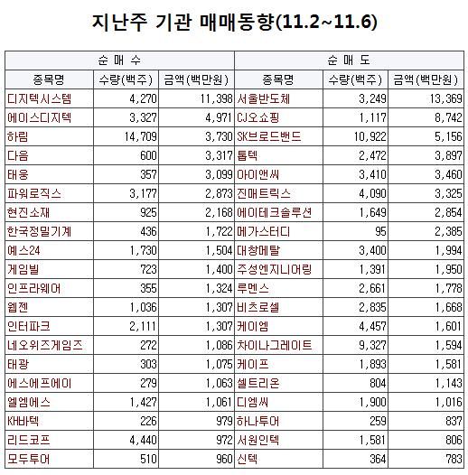 반면 기관은 디지텍시스템(114억원)과 에이스디지텍(50억원), 하림(37억원), 다음(33억원), 태웅(31억원) 등은 순매수 상위 종목으로 꼽혔다.