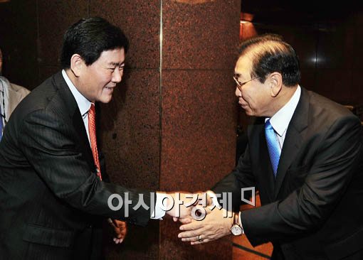 간담회에 참석한 최경환(왼쪽) 장관이 정준양 포스코 회장과 인사를 나누고 있다.