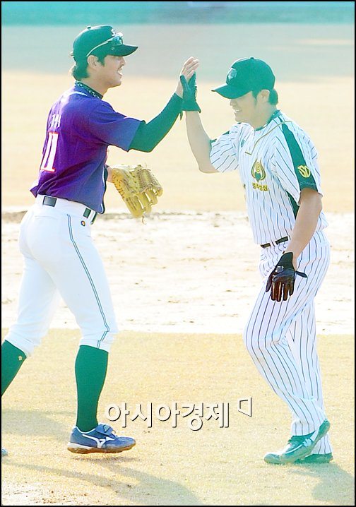 [청주(충북) = 아시아경제 박성기 기자]야구선수 추신수(클리블랜드 인디언스 소속)가 9일 오후 3시 충청북도 청주 종합운동장 내 야구장에서 진행된 KBS 2TV '천하무적 야구단' 대 '성심야구부'와의 경기에서 '성심야구부' 일일 감독 겸 4번 타자로 출전, 김성수와 악수를 나누고 있다.
