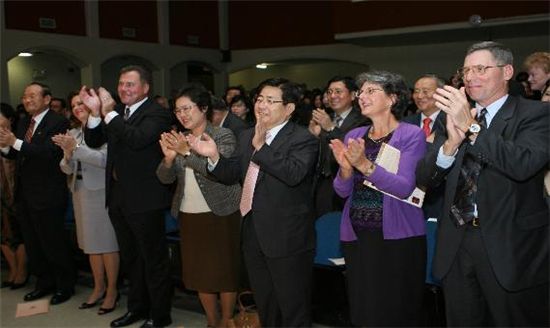 [아시아경제 박종일 기자] 9일 오후 7시 서울 용산 주한 미8군기지 내 서울아메리칸하이스쿨에서 열린 '한미친선음악회'에서 맹정주 강남구청장 부부(가운데)가 강남심포니오케스트라의 연주에 기립 박수를 보내고 있다.