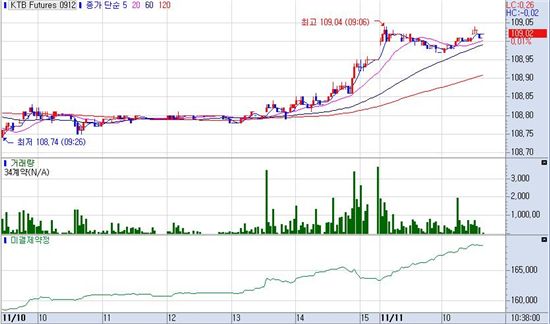 같은시간 국채선물은 전일대비 7틱 상승한 109.02를 기록하고 있다. 외국인이 1996계약을 순매수중이고 은행 또한 595계약 순매수하고 있다. 반면 증권이 1655계약 순매도로 대응중이다. 개인과 투신도 각각 519계약과 484계약을 순매도하고 있다.