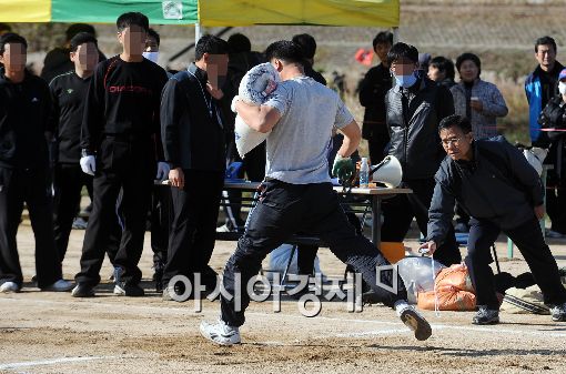 [아시아경제 이재문 기자] 11일 오전 서울 구로구 고척교 아래 축구장에서 열린 환경미화원 체력 실기테스트에서 응시자들이 10kg 모래주머니를 멘 채로 달리기를 하고 있다.