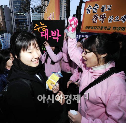 [아시아경제 윤동주 기자] 2010학년도 대학수학능력시험일인 12일 서울 풍문여자고등학교 시험장에서 수험생들이 후배들의 응원을 받으며 시험장으로 들어가고 있다.