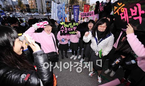 [아시아경제 윤동주 기자] 2010학년도 대학수학능력시험일인 12일 서울 풍문여자고등학교 시험장에서 응원 나온 후배들이 선배들의 수능 대박을 기원하며 거수 경례를 하고 있다.
