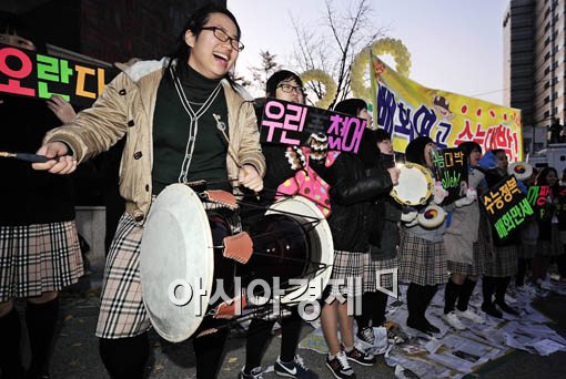 [아시아경제 윤동주 기자] 2010학년도 대학수학능력시험일인 12일 서울 풍문여자고등학교 시험장에서 응원 나온 후배들이 시험을 보는 선배들을 위해 열띤 응원을 하고 있다.