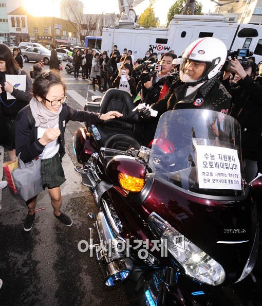 [아시아경제 윤동주 기자] 2010학년도 대학수학능력시험일인 12일 서울 풍문여자고등학교 시험장에 지각한 한 수험생이 자원봉사 오토바이를 타고 고사장으로 들어가고 있다.