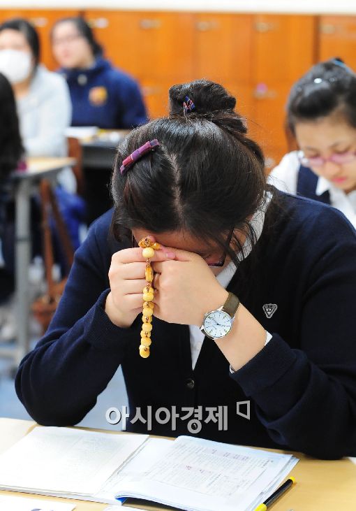 [아시아경제 이재문 기자] 2010학년도 대학수학능력시험일인 12일 오전 서울 종로구 필운동 배화여자고등학교 수험장에서 수험생들이 기도를 하고 있다.