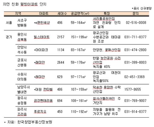 [아시아경제 김민진 기자] 주변 녹지율이 풍부하고 조망 좋은 자연친화적인 아파트 단지를 찾는 수요층이 늘고 있다.