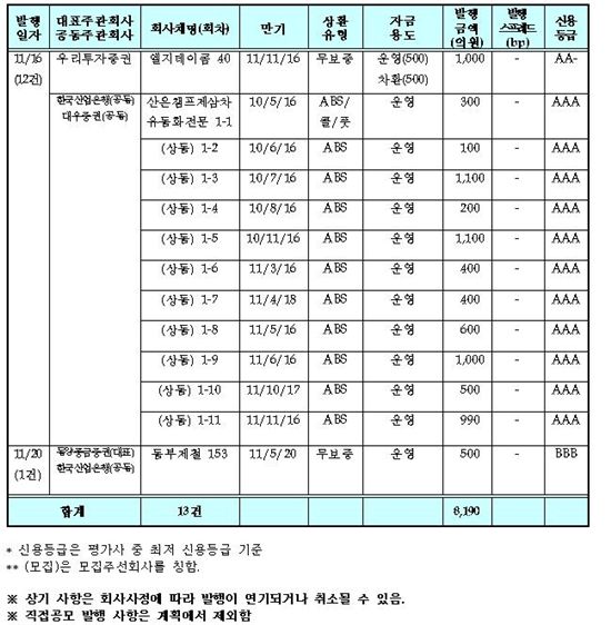 채권종류별로는 무보증 일반회사채가 2건에 1500억원, ABS가 11건에 6690억원이다. 자금용도는 운영자금이 7690억원, 차환자금이 500억원으로 나타났다.