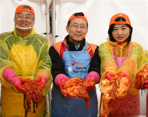 [아시아경제 김혜원 기자] 구자영 SK에너지 사장(왼쪽 두번째)과 임직원 및 일반 자원봉사자 200여명이 대학로 마로니에 공원에서 '행복나눔 김장행사'를 열었다.(사진 왼쪽부터 차선각 YMCA부이사장, 구자영 SK에너지 사장, SK에너지 임직원)