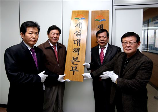 $pos="C";$title="";$txt="한인수 금천구청장(왼쪽 두 번째)과 구청 관계자들이 구청 재해방재센터에 ‘제설대책본부’ 현판을 달고 있다.