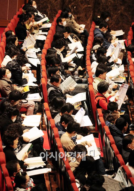 [아시아경제 윤동주 기자] 15일 서울 경희대 평화의전당에서 열린 2010 대학 입시설명회에 참석한 수험생들과 학부모가 대입배치표를 보고 있다.
